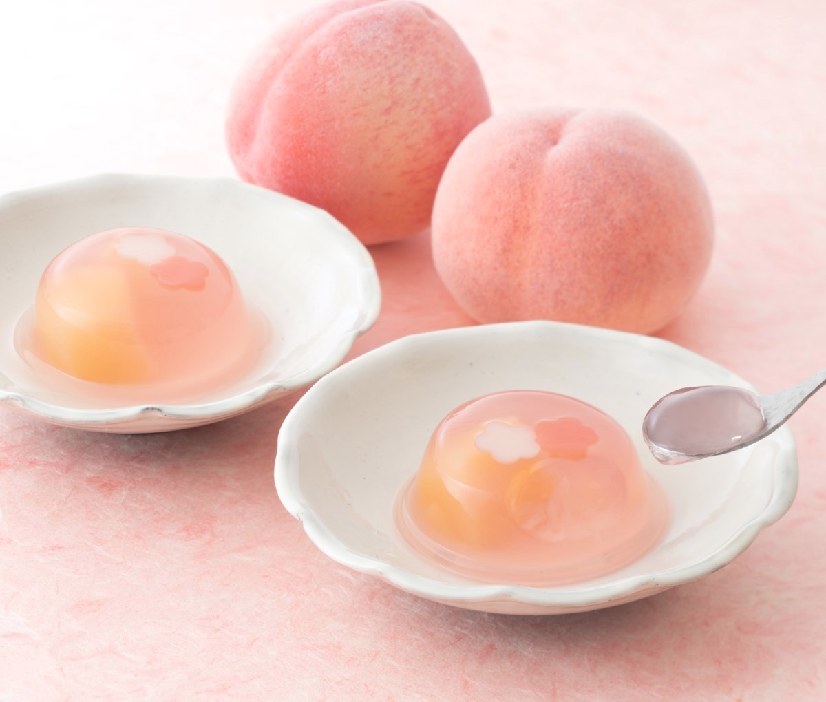 吉野本葛を使用したゼリーに国産白桃の果肉をこめ、2色の桃の花をちらしました。
