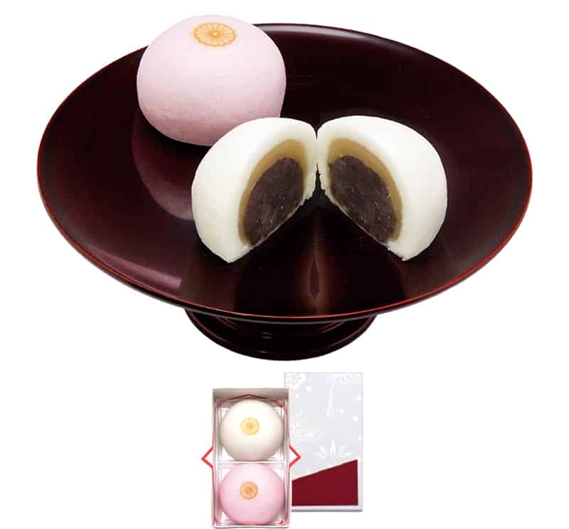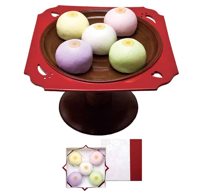 おめでたい五色の、小倉と白の二重あん入薯蕷饅頭