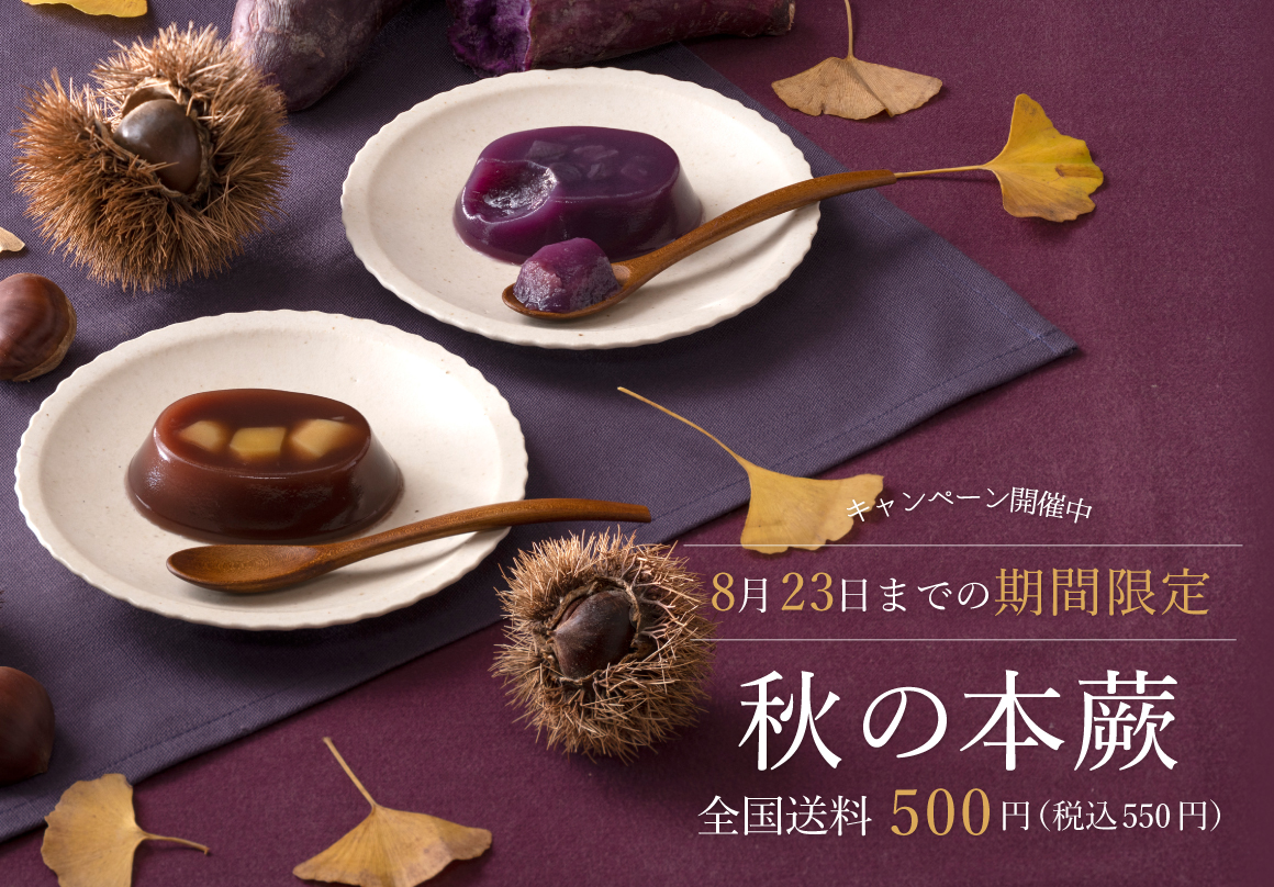 独特なぷるぷる食感が美味しい人気涼菓「本蕨」に、"栗" と "紫いも" をこめた秋だけの美味しさ『秋の本蕨』が今秋パッケージをリニューアルいたしました。