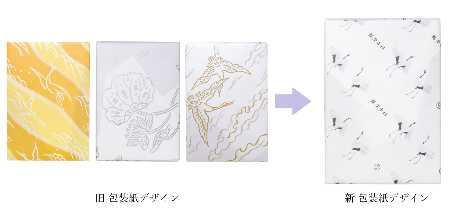 新しい包装紙のデザインは、1992年に竣工いたしました本店建物内装のために、日本画家・上村淳之 先生に描いていただきました杉戸絵「丹頂鶴」を元に制作いたしました。