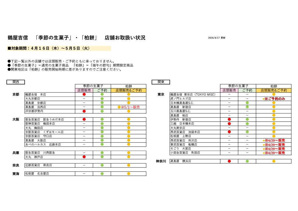 「季節の生菓子」と「柏餅」のお取扱い店舗・期間が異なります。