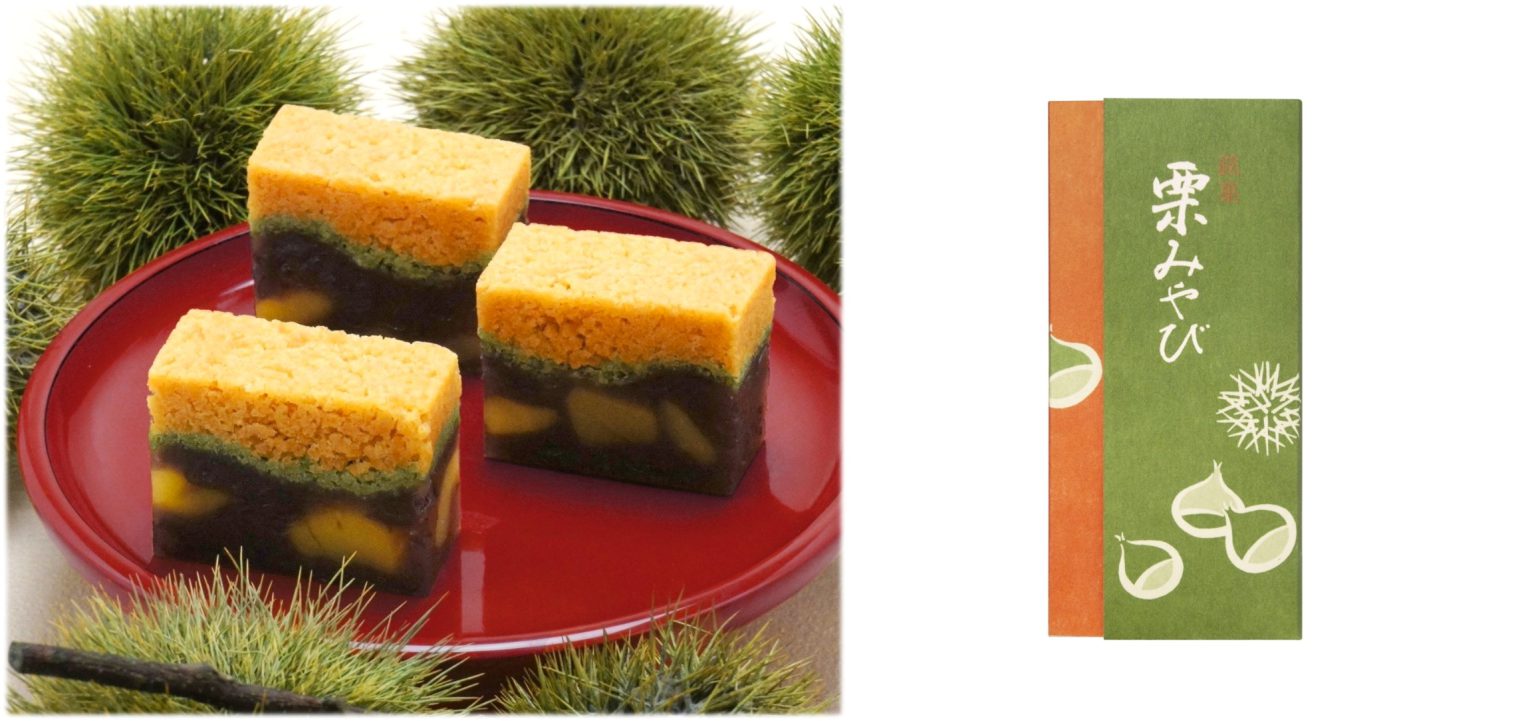 リニューアルを記念に、紅葉で色づく京都の山々の情景を、ほろっとほどける村雨(そぼろあん)と国産和栗をこめた小倉羹の二層羊羹『栗みやび』を、数量限定でお取扱いいたします。