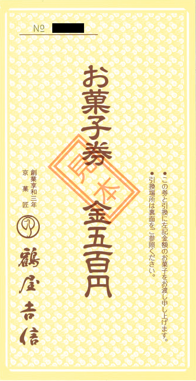 「お菓子券」をお持ちのお客様におかれましては、終了日までに最寄りの鶴屋吉信店舗にてご利用いただきますようお願い申し上げます。