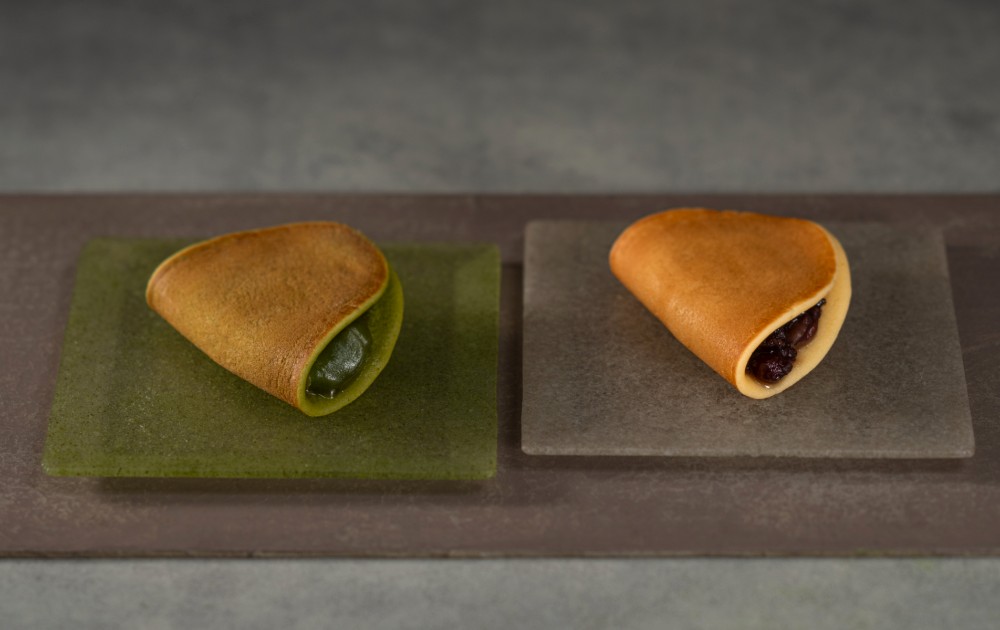抹茶をこめた生地を銅板でじっくりと焼き上げた自慢の焼皮に、抹茶あんをはさみました。