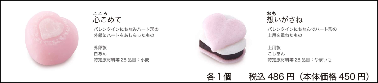 店頭では、2月11日~2月14日の4日間限定で、「心こめて」・「想いがさね」のバレンタイン生菓子を販売いたします。