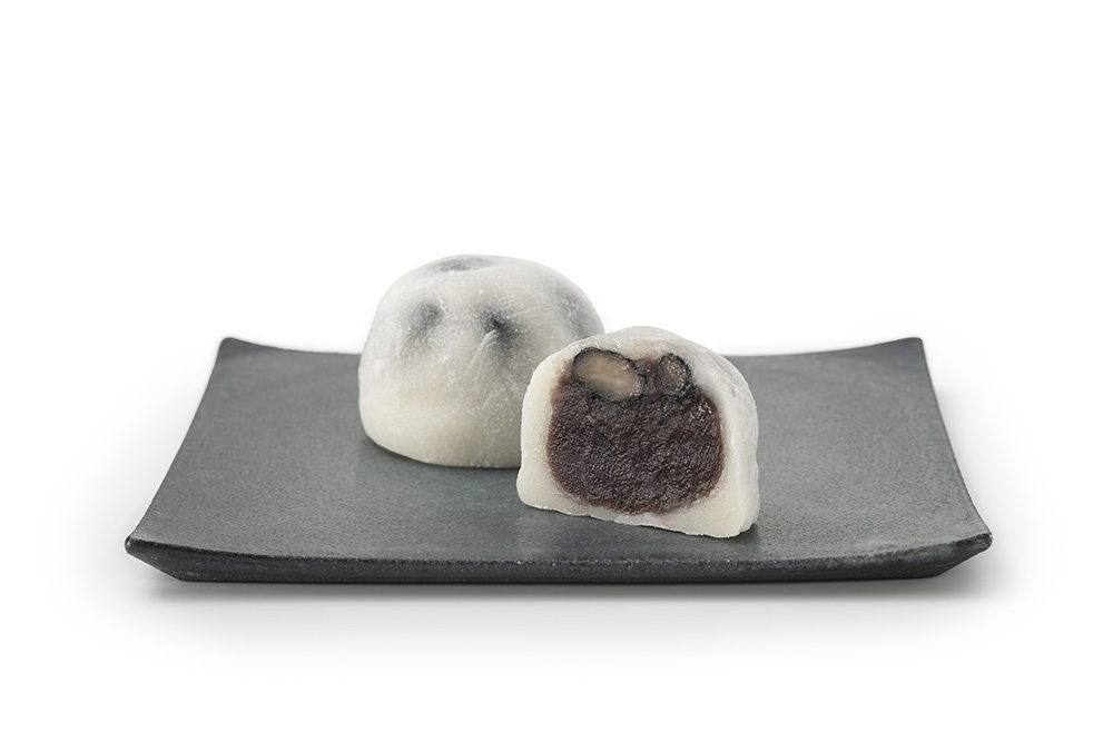 京都丹波産黒大豆(くろだいず)を使用。ほのかに塩味をきかせツヤツヤふっくらと炊き上げ、やわらかな求肥にこめて、まろやかなこしあんをたっぷり包みました。