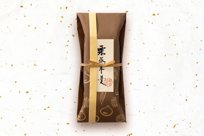 お詰合せの仕様に合わせた、従来のシンプルな箱型パッケージ(工藝菓(こうげいか)シリーズと同様)から、デザインを一新。栗の意匠をあしらった風合いのある包み紙で丁寧に手包みし、「栗蒸羊羹」の銘紙を沿え、金色の紐で留めてきらりと高級感のあるアクセントといたしました。重厚感のあるパッケージは、単品でお持ちいただいても、秋の贈り物・お手土産としてもふさわしい仕上がりとなっております。