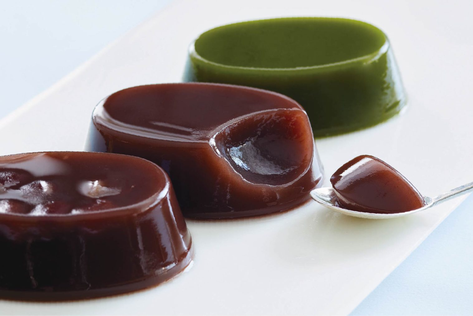 蕨(わらび)の根からとれるデンプンは、日本古来の野の味覚。その蕨粉を活かした、ぷるぷると独特の食感と「こしあん」「抹茶」「小倉」和菓子ならではの3種の風味が味わえる涼菓に仕上げました。