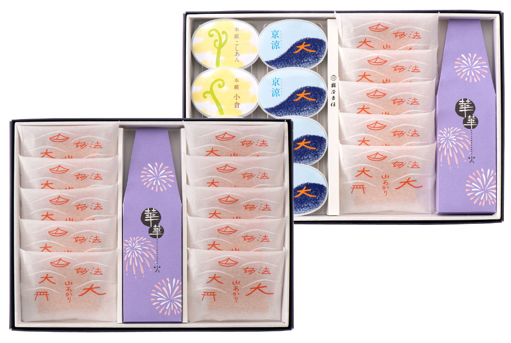 もっちり、しっとり。もち粉を使用した独特の食感が美味しい焼皮に、吟味した小豆を丁寧に炊き上げた小倉あんを包んだ焼菓子を「五山の送り火」の明々とした意匠の包み紙で装いました。