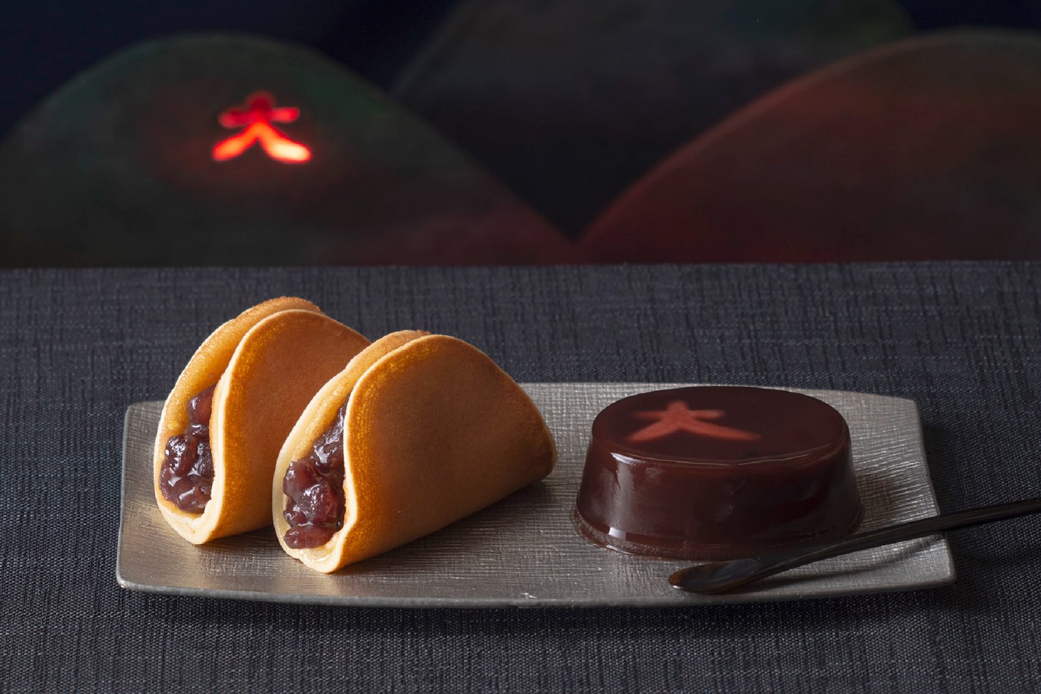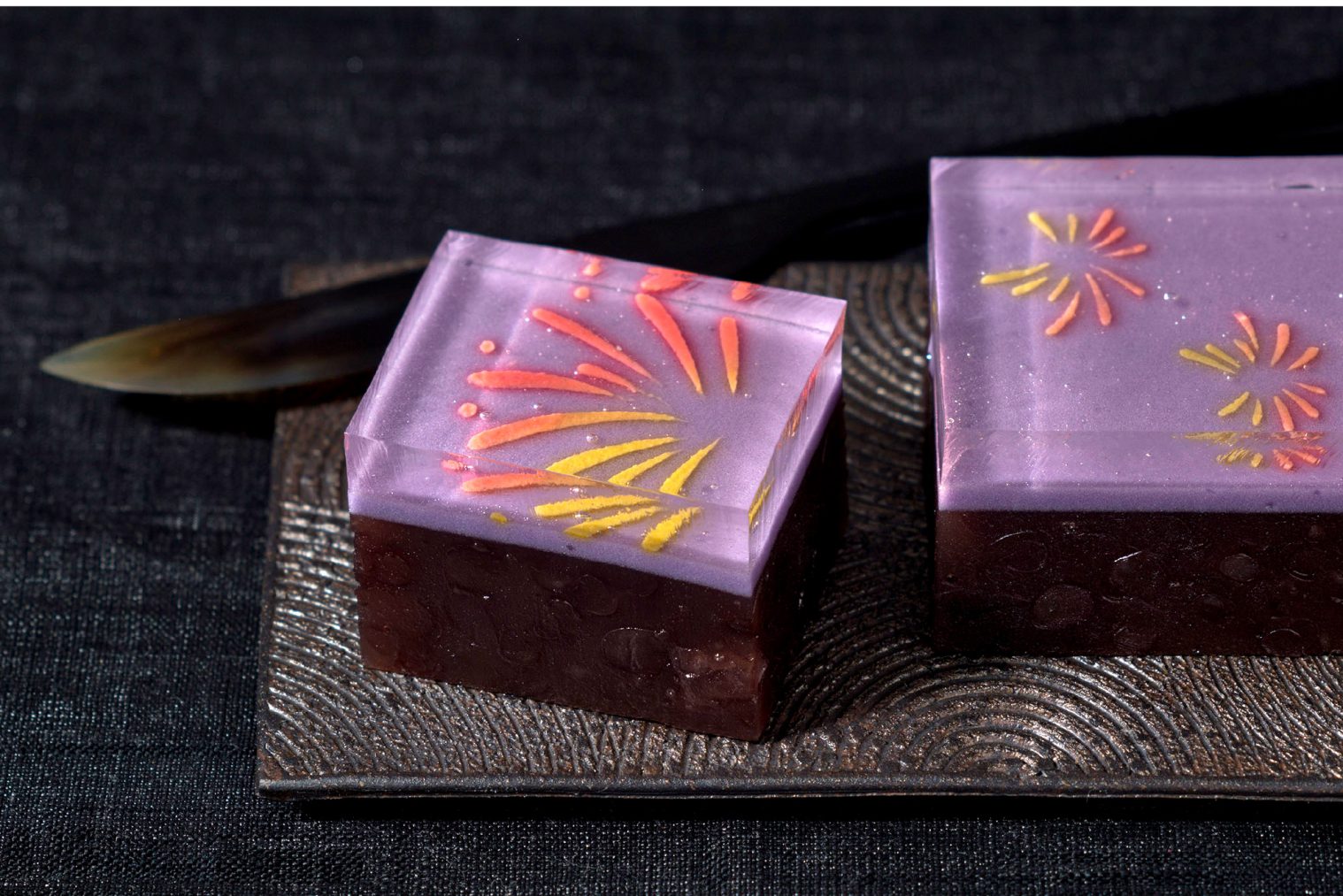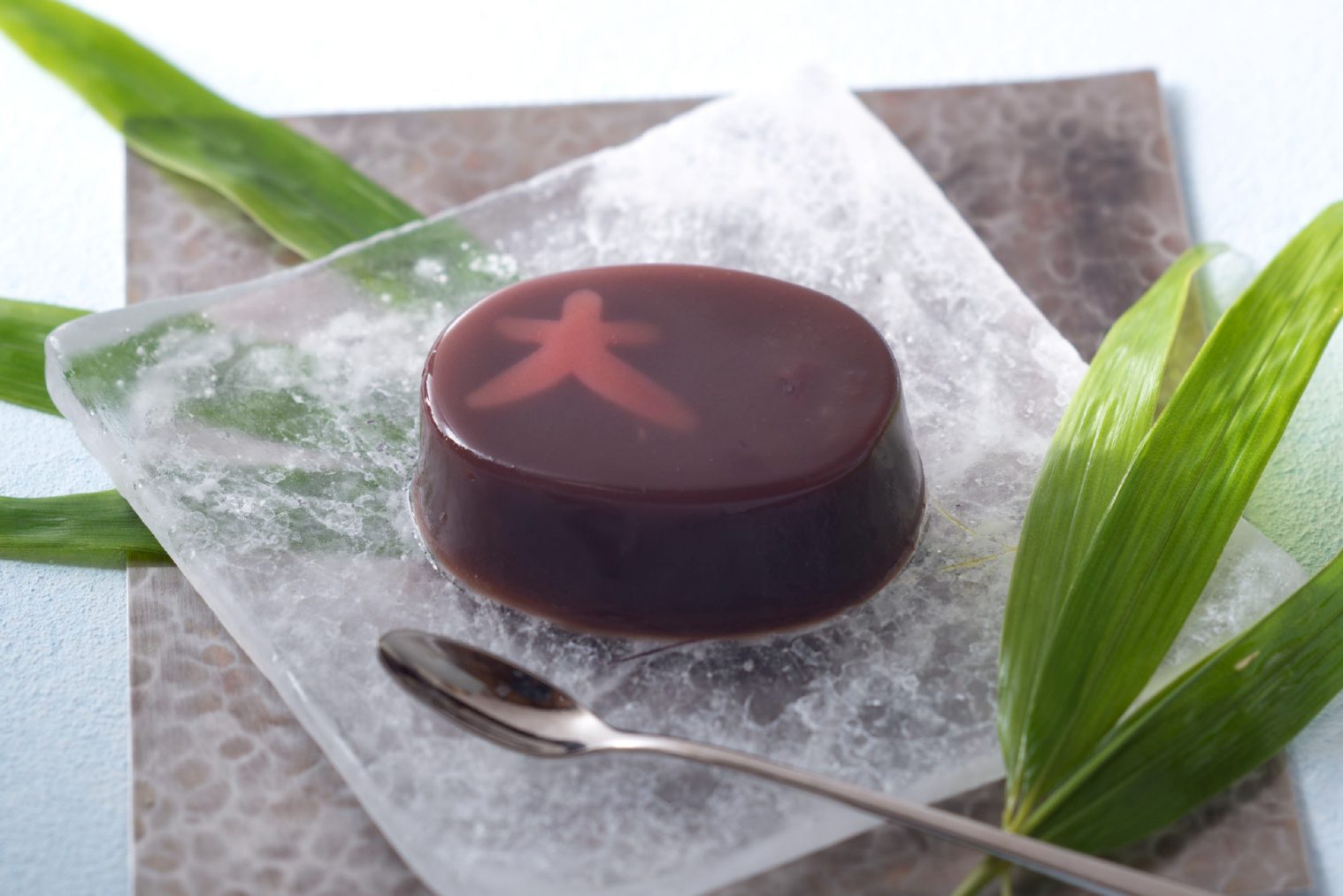 京都ならではの風情を、特製の水羊羹にいたしました。お皿に盛りつけていただくと、如意ヶ嶽(にょいがだけ)に見立てた水羊羹に、炎を模した紅あんの大文字が浮かびあがります。