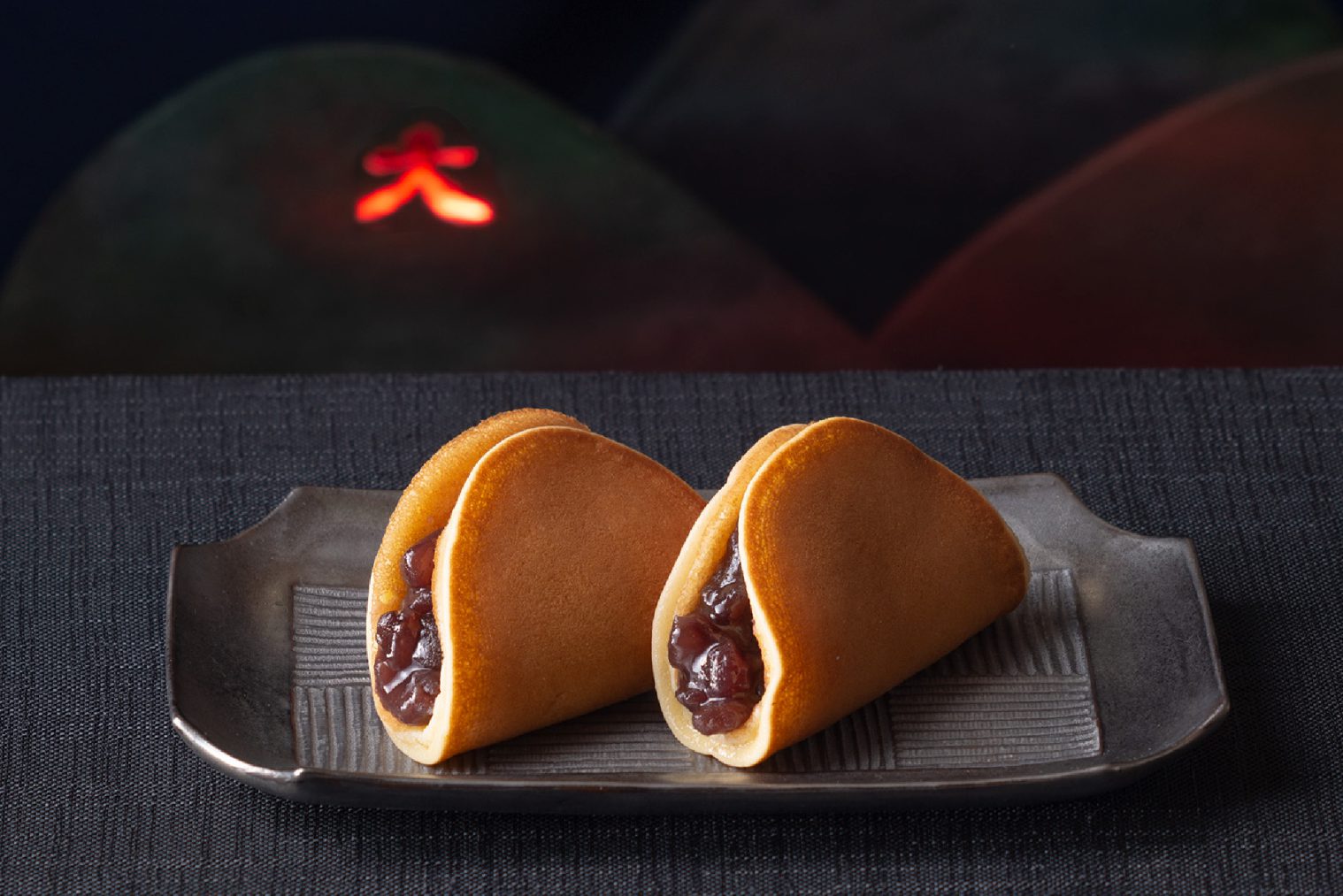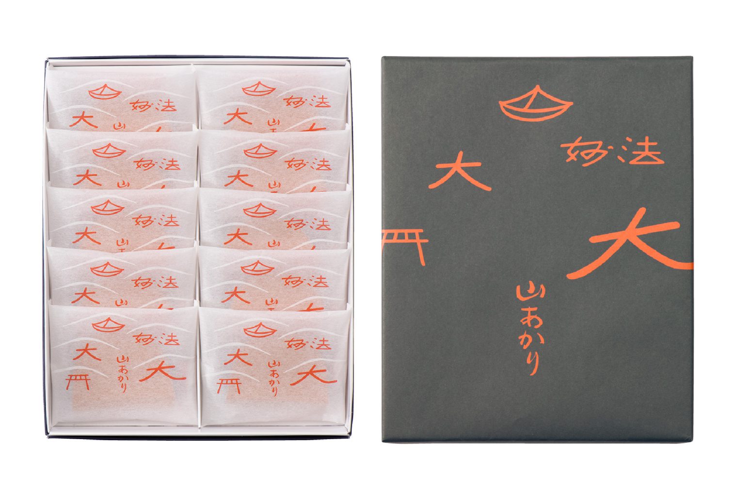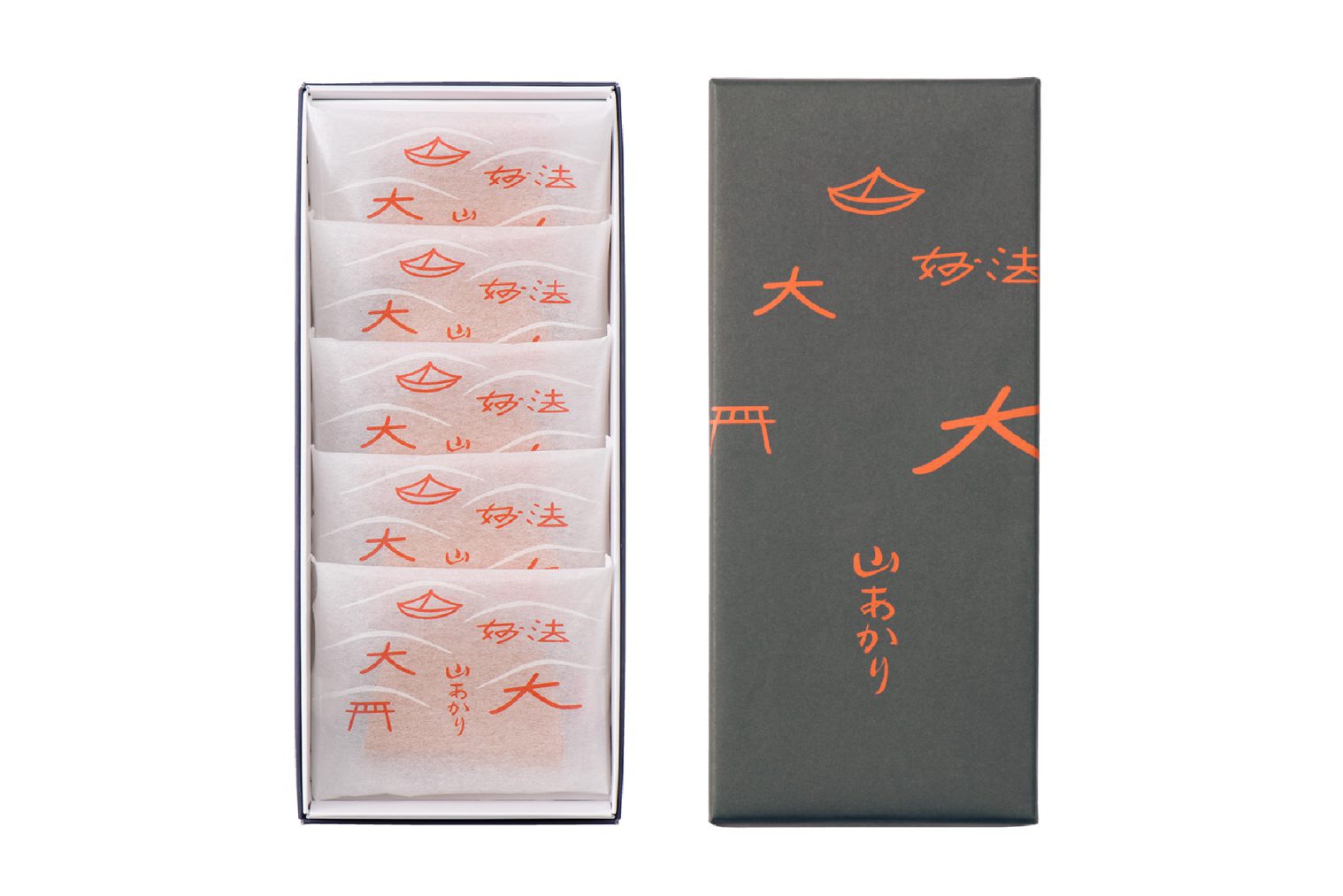 「山あかり」は五山送り火を表す包みに入った焼き菓子です。山に見立てた山型の焼皮は、米粉を用いてじっくりと焼き上げることで、しっとり・もっちり、やみつきの食感に。風味豊かな粒あんをはさみこみました。