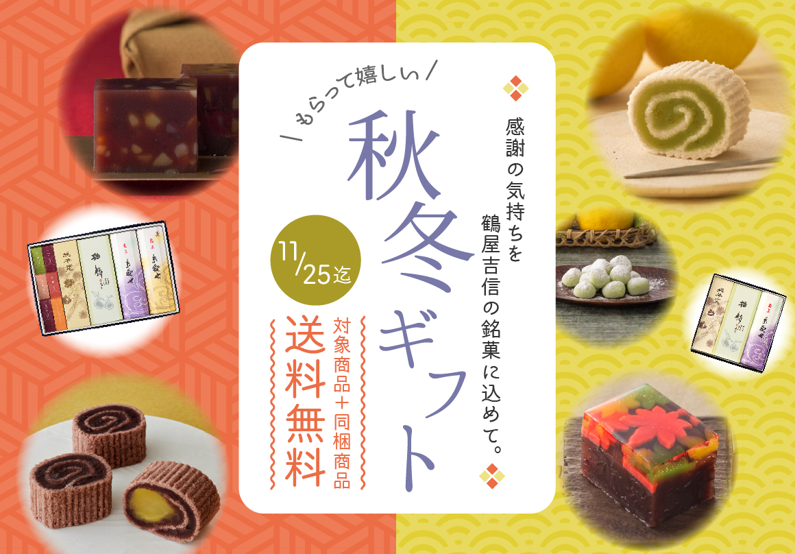 鶴屋𠮷信では、秋冬のごあいさつに、お歳暮のさきどりにもおすすめな選りすぐりの和菓子を、全国どこでも送料無料でお届けする「もらって嬉しい 秋冬ギフト WEB限定送料無料キャンペーン」を2022年11月1日(火)〜11月25日(金)まで公式オンラインショップにて開催いたします。