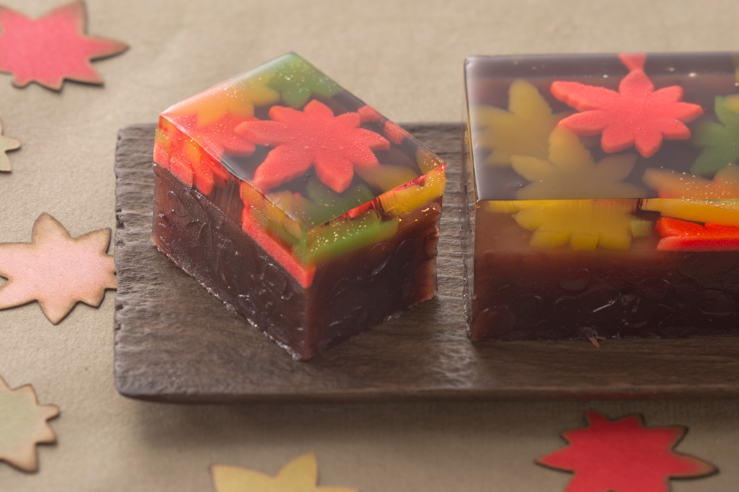 古都を彩るあざやかな紅葉を、きらりと透き通る琥珀羹の中にとじこめた、職人の技が光る工芸品のような棹物「工藝菓(こうげいか)」シリーズ。かさなる紅葉を、着物の“かさね”の色目にたとえました。