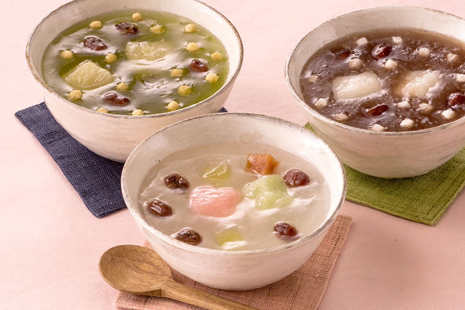 ころっと可愛い3つの小袋。封をほどき、中身をお好きな器にあけて熱々のお湯を注ぐだけで、上品なくず湯がお楽しみいただけます。琥珀や小豆の食感も楽しい「みつ豆くず湯」、抹茶の香りがかぐわしい「挽茶あられ」、こしあんの風味しみじみ「風流しるこ」。秋冬の寒さがより美味しさを引き立てる、ほっこりあたたかな一品です。