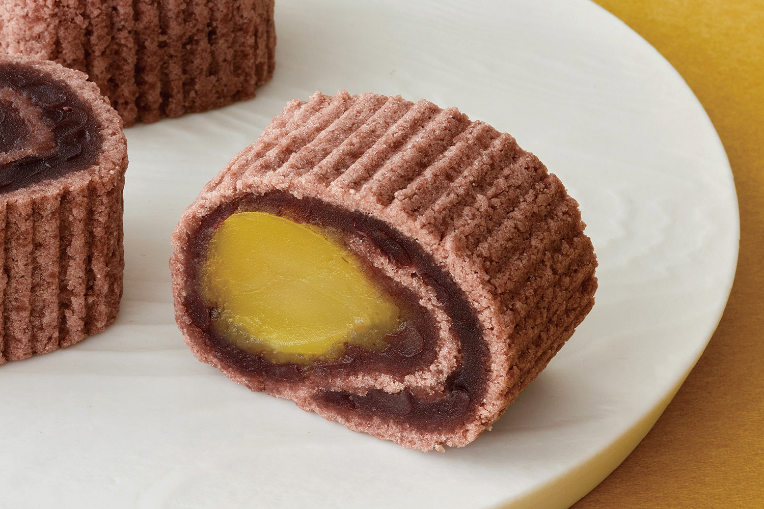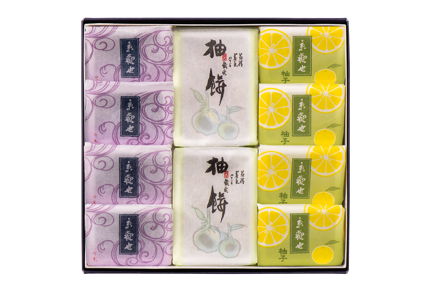 ほろほろの白村雨に、備中白小豆製のなめらかな白あん製羊羹を巻き込み、蜜漬けの柚子皮をこめて。柚子が爽やかに香る、秋限定の京観世です。お召し上がりやすい個包装タイプ。