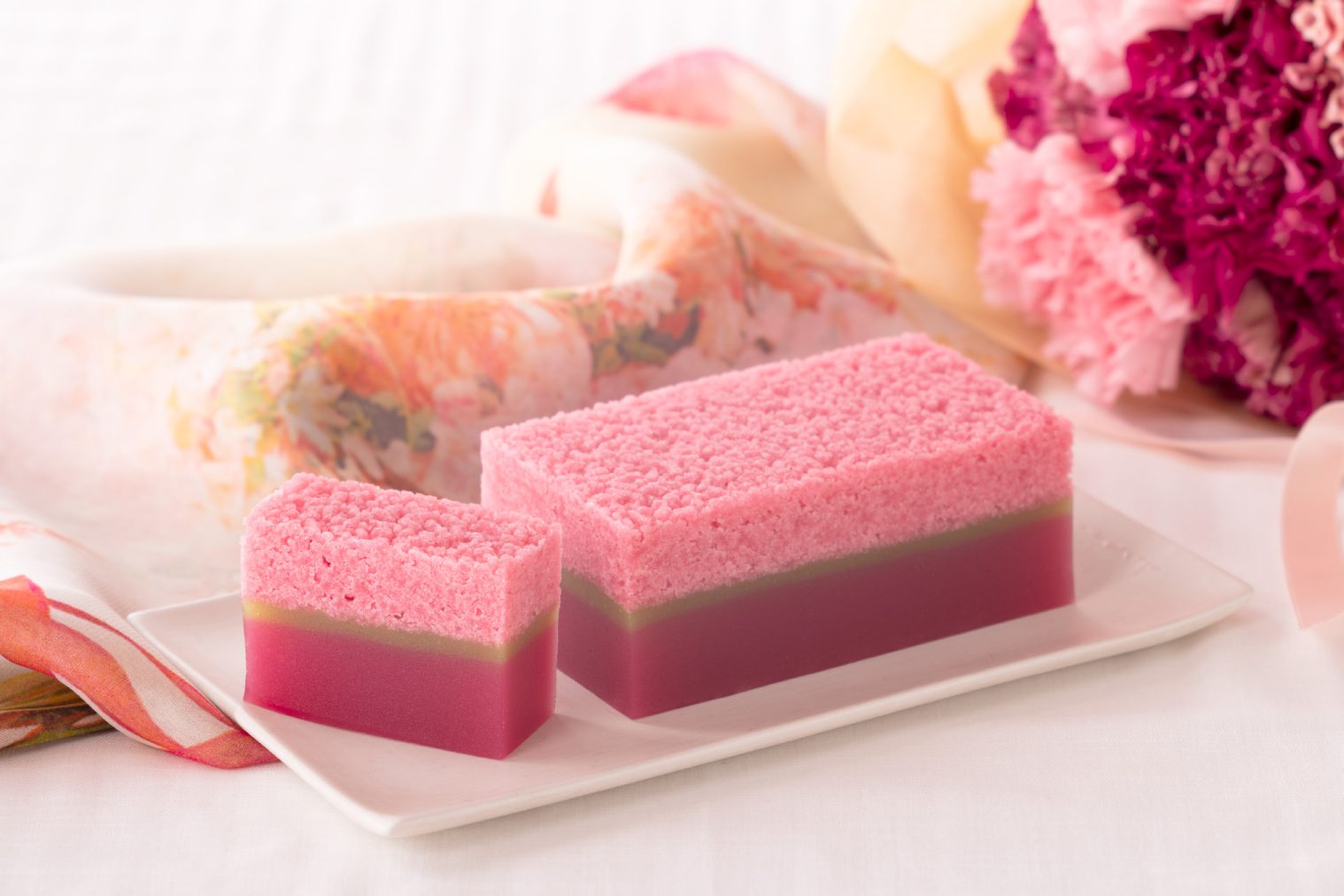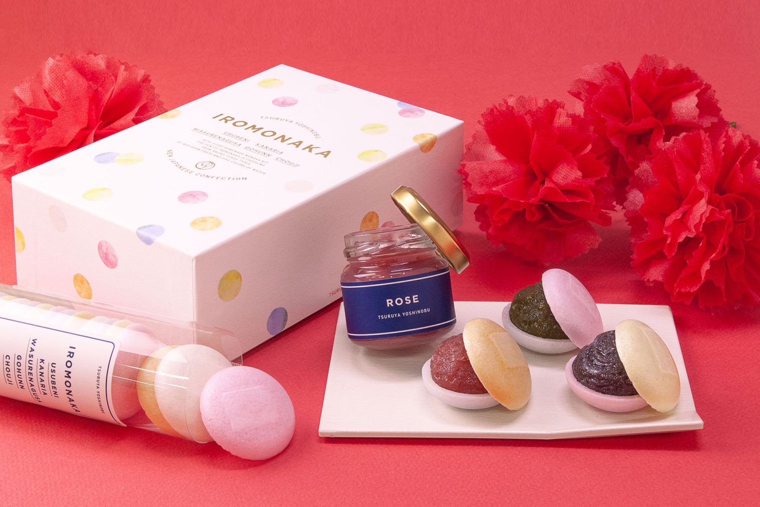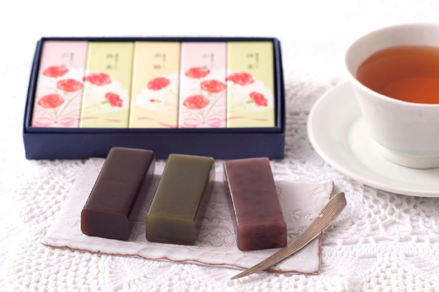 お手軽にお楽しみいただける人気のミニ羊羹3種を、カーネーションの花束の意匠をあしらった、母の日限定パッケージで包みました。