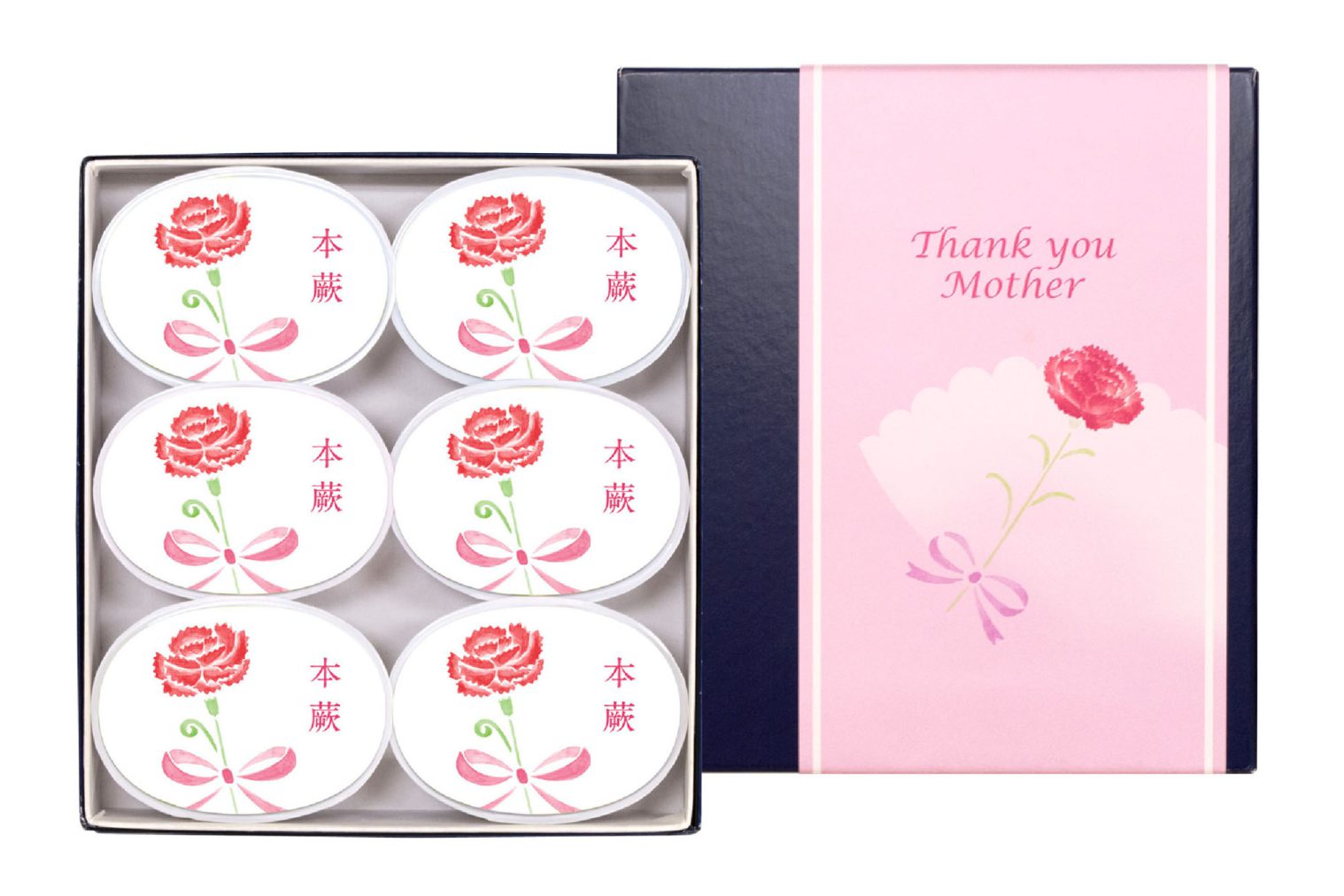 母の日ならでは、カーネーションの意匠をあらわしたパッケージや、専用のかわいい掛け紙仕上げはギフトにぴったり。はなれて暮らすご家族へも、オンラインショップをぜひご利用くださいませ。