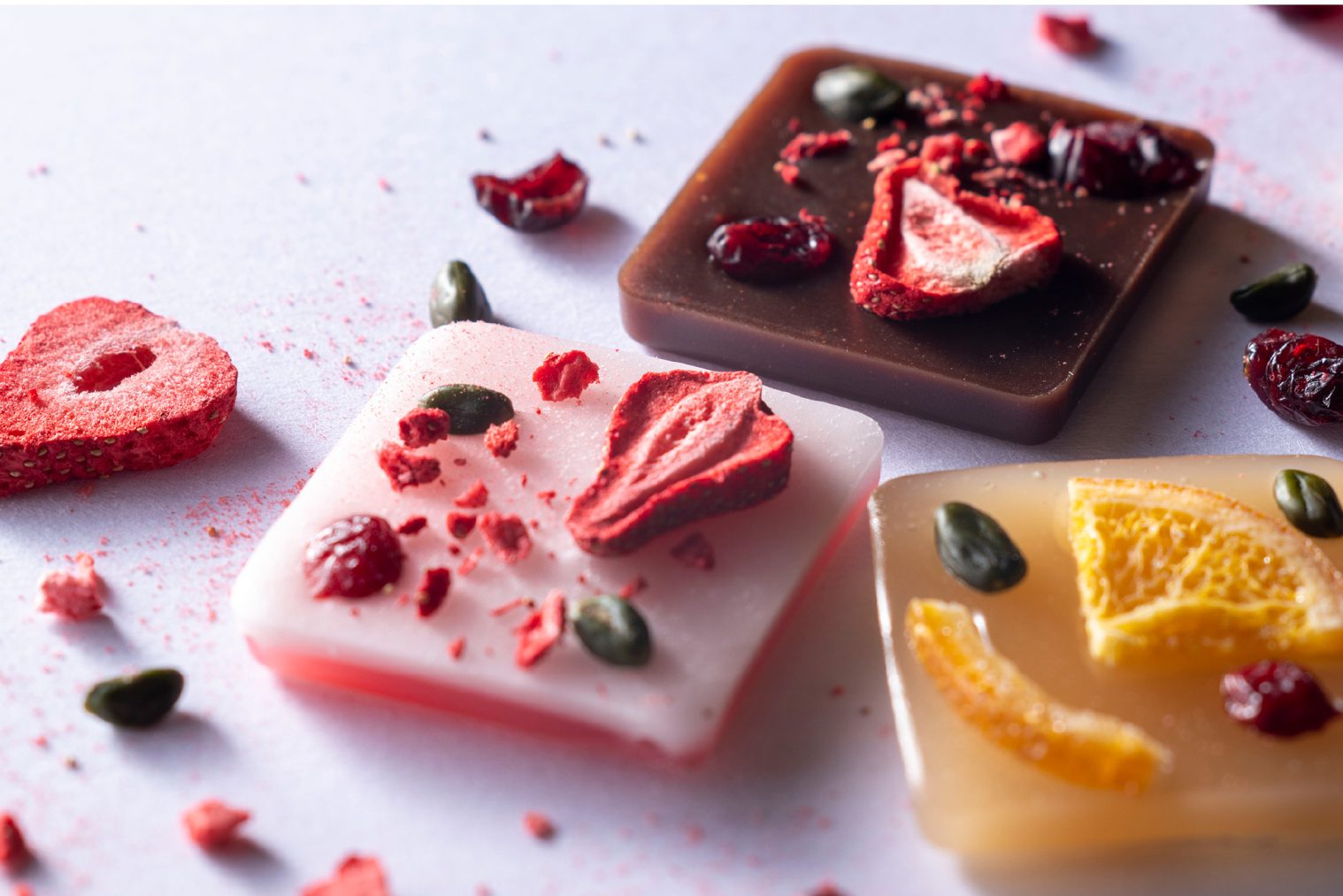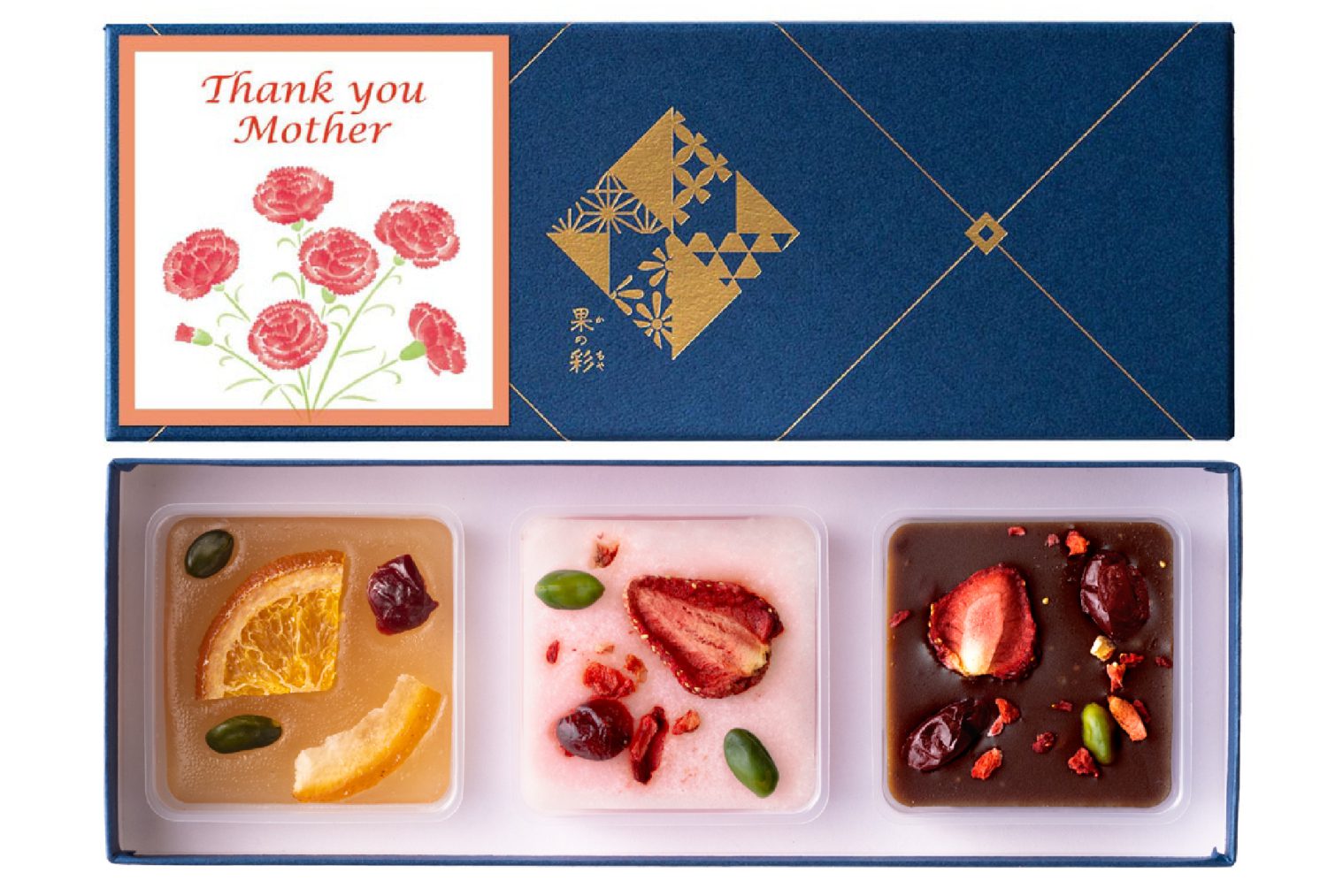 タブレットのように薄くつくったようかんと、素材の美味しさをぎゅっととじこめた色とりどりのドライフルーツやナッツをあわせた3種のあじわいをひと箱におさめた、新感覚の和菓子「果の彩」。
