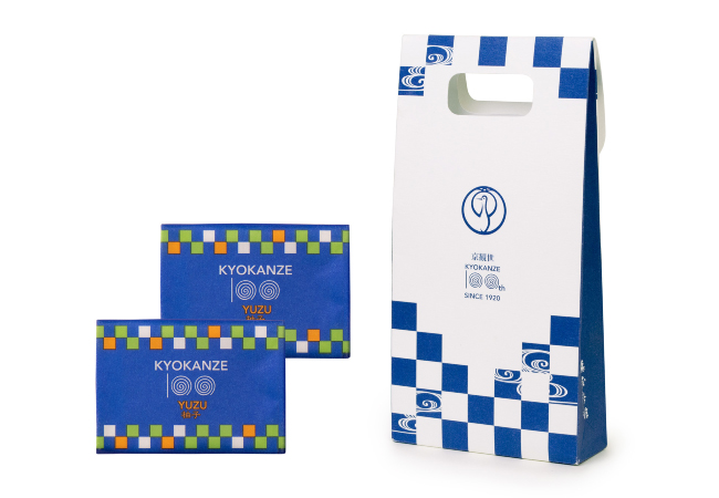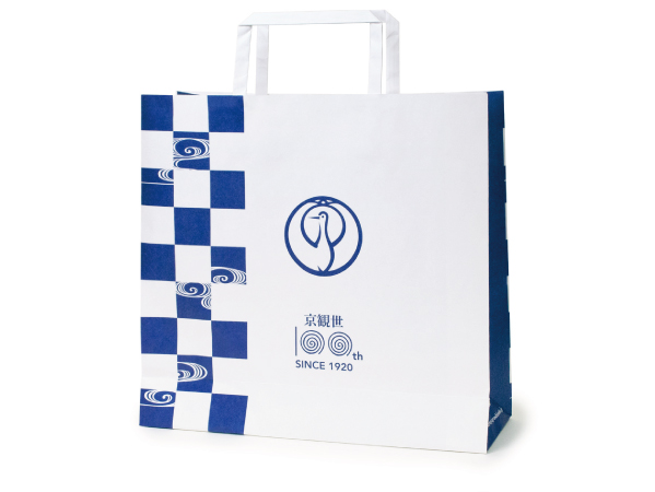 100周年記念京観世のパッケージとリンクした紺色の市松模様に、京観世の由来ともなった観世水(かんぜすい)文様をあしらった、明るく爽やかな紙袋です。