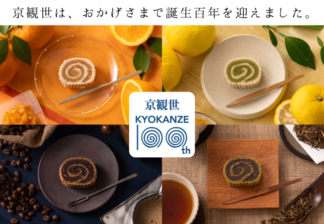 1920年の誕生以来、弊社の代表銘菓としてご愛顧いただいてきた銘菓「京観世」は2020年で誕生からついに100周年を迎えました。長年のご愛顧へ感謝をこめ、記念の新風味「柚子」「ほうじ茶」「オレンジ」「珈琲」を期間限定で新発売。京菓子司がおくる、和菓子の新たな美味しさとの出会いをどうぞ。
