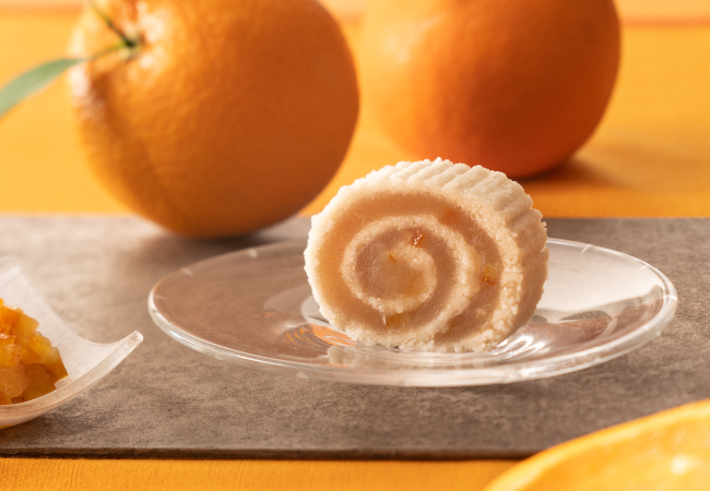 京観世にマッチする柑橘類をと吟味を重ね、淡い色づかいが目にも愉しいあんの渦に甘ずっぱいオレンジピールをちりばめて。
