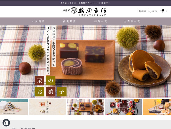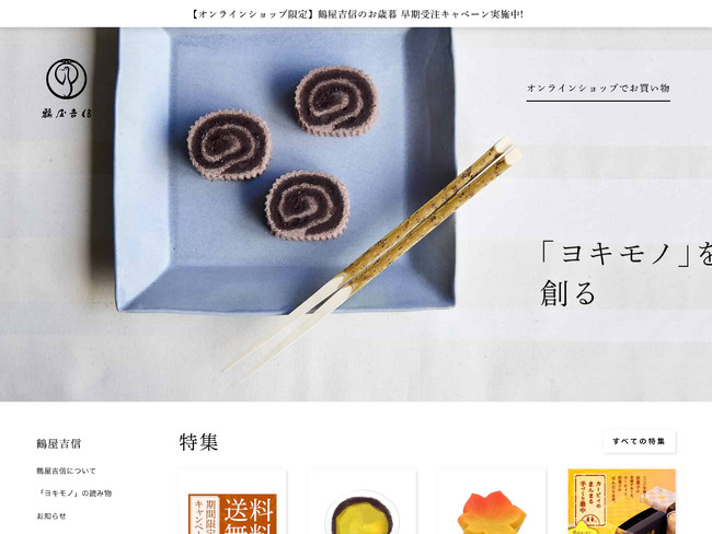 当社ではかねてより、「鶴屋吉信 公式オンライン」と題したひとつの公式サイトにて、鶴屋吉信の会社情報からお取扱中の商品のご紹介、お菓子にまつわる読み物などをまとめてご案内するとともに、鶴屋吉信のお菓子をWEBでお求めいただける公式オンラインショップとしてのお買い物機能をご提供してまいりました。