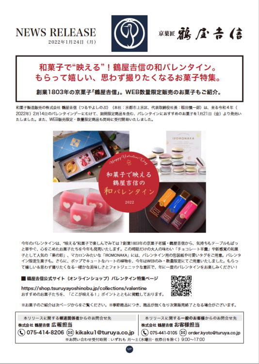 2022年1月25日(火)和菓子で“映える”!鶴屋𠮷信の和バレンタイン。もらって嬉しい、思わず撮りたくなるお菓子特集。下記サムネイルよりPDFファイルをご覧ください。(1,092KB)ダウンロードメディア掲載・取材依頼は<こちら>