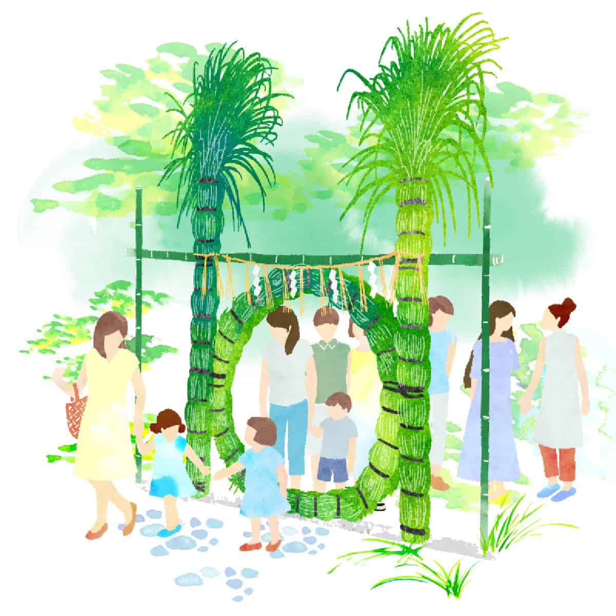 各地の神社で行われる、参道や鳥居に設けられた茅(ちがや)で編んだ大きな輪をくぐる“茅の輪くぐり”